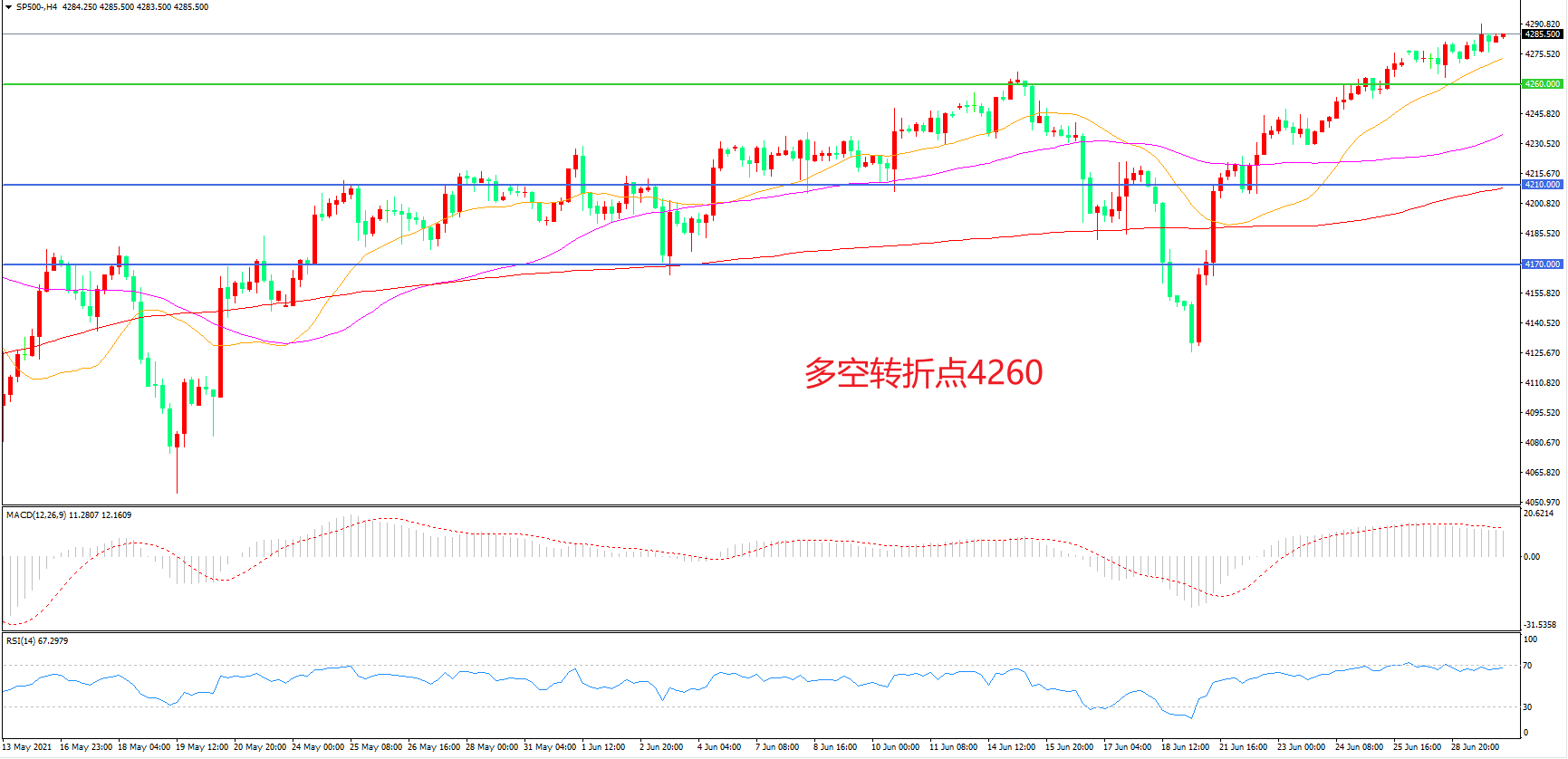 4小时图看,标普500阳线连续拉升,上行趋势较为明显,均线系统呈多头排列,MACD红柱增加,RSI指标走平,日内震荡上行概率较大。