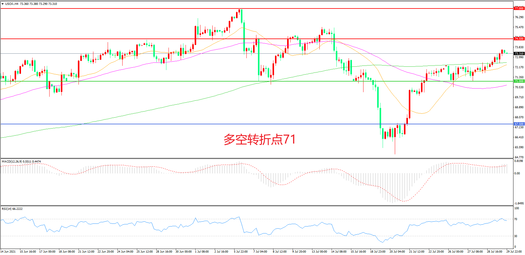 周四(7月29日),全球最大石油消费国美国的原油库存降至2020年1月以来最低缓解了人们对经济放缓的担忧,美国WTI原油震荡上行,收报73.30美元/桶。目前整体市场的风险偏好和美元指数的进一步走软都为油价提供支撑,在市场信心得到修复后,未来油价大概率维持震荡上行的走势。