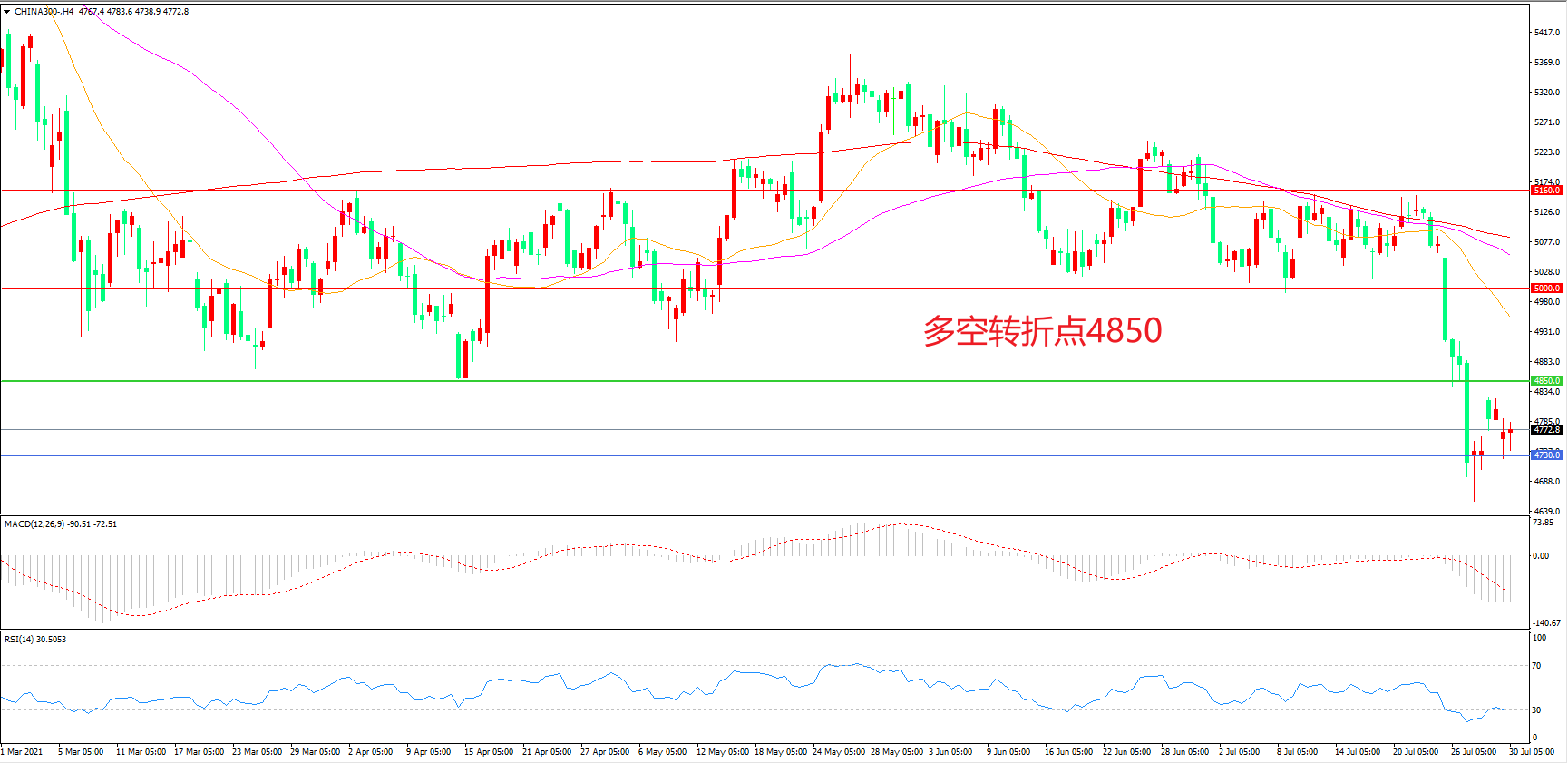 4小时图看,沪深300长阴下破后延续低位震荡,短线行情有所企稳,4850成为上方阻力,4730成为下方支撑,MACD红柱增加,RSI指标向上,日内延续震荡概率较大。