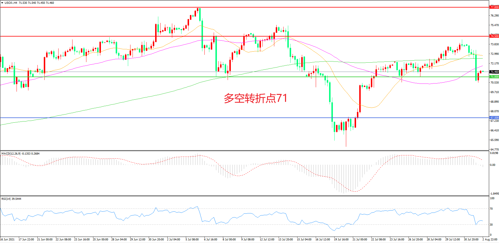 4小时图看,油价长阴下破,前期涨势被吞噬殆尽,短线行情陷入低迷,71美元成为下方支撑,均线系统成为上方阻力,MACD红柱缩短,RSI指标走平,日内油价延续震荡概率较大。