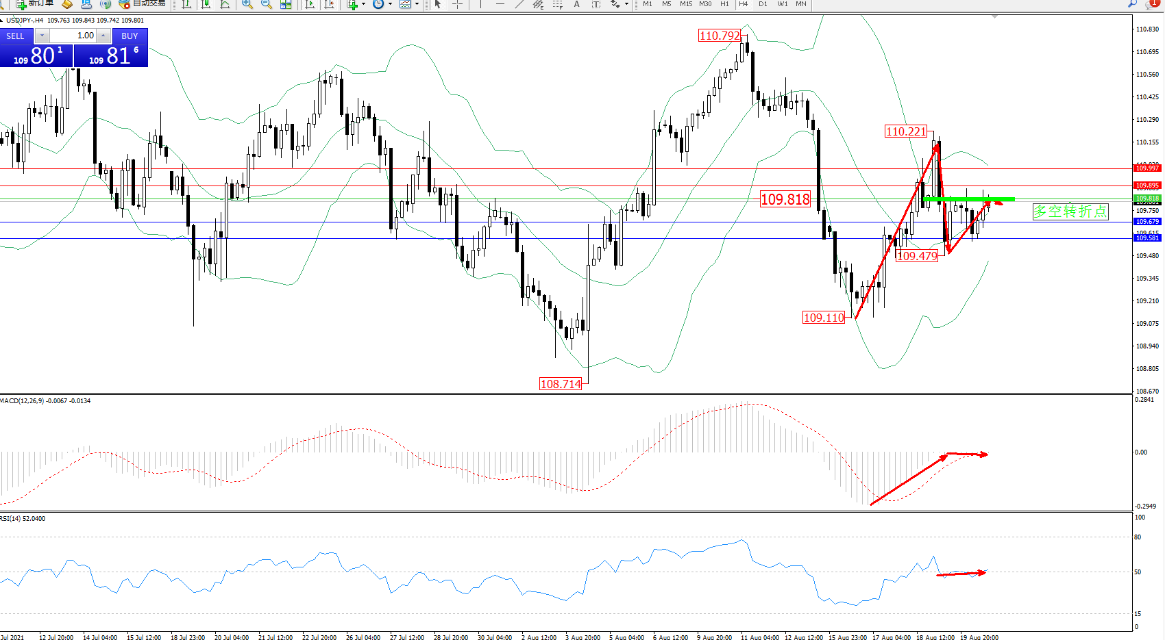 技术点评:低位多头动力持续震荡向上移动,高位抵达110.221位置后遇阻回撤,纠结于布林带指标中上轨区间震荡向上移动,短期或维持在中轨上側徘徊,高位阻力相对存在,布林带指标呈收口走势中,MACD指标低位多头动力持续震荡上移至0轴线附近弱势徘徊中,RSI指标纠结于50均衡线附近窄幅整理平移;