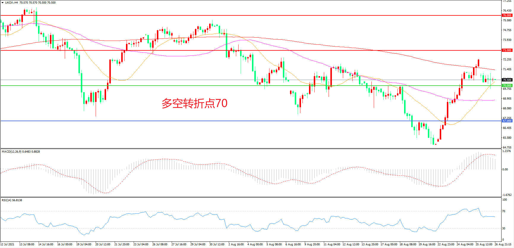 4小时图看,油价突破70美元后延续窄幅震荡,21周期均线成为下方支撑,200周期均线成为上方阻力,MACD红柱增加,RSI指标走平,日内延续震荡概率较大。