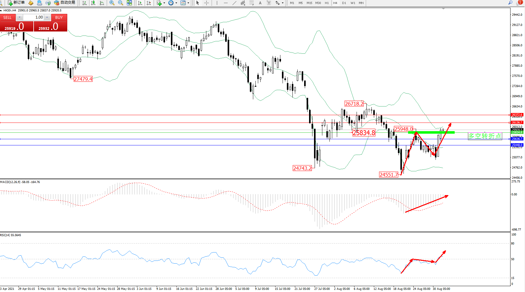 交易策略:25834上方看涨,目标26136、26372