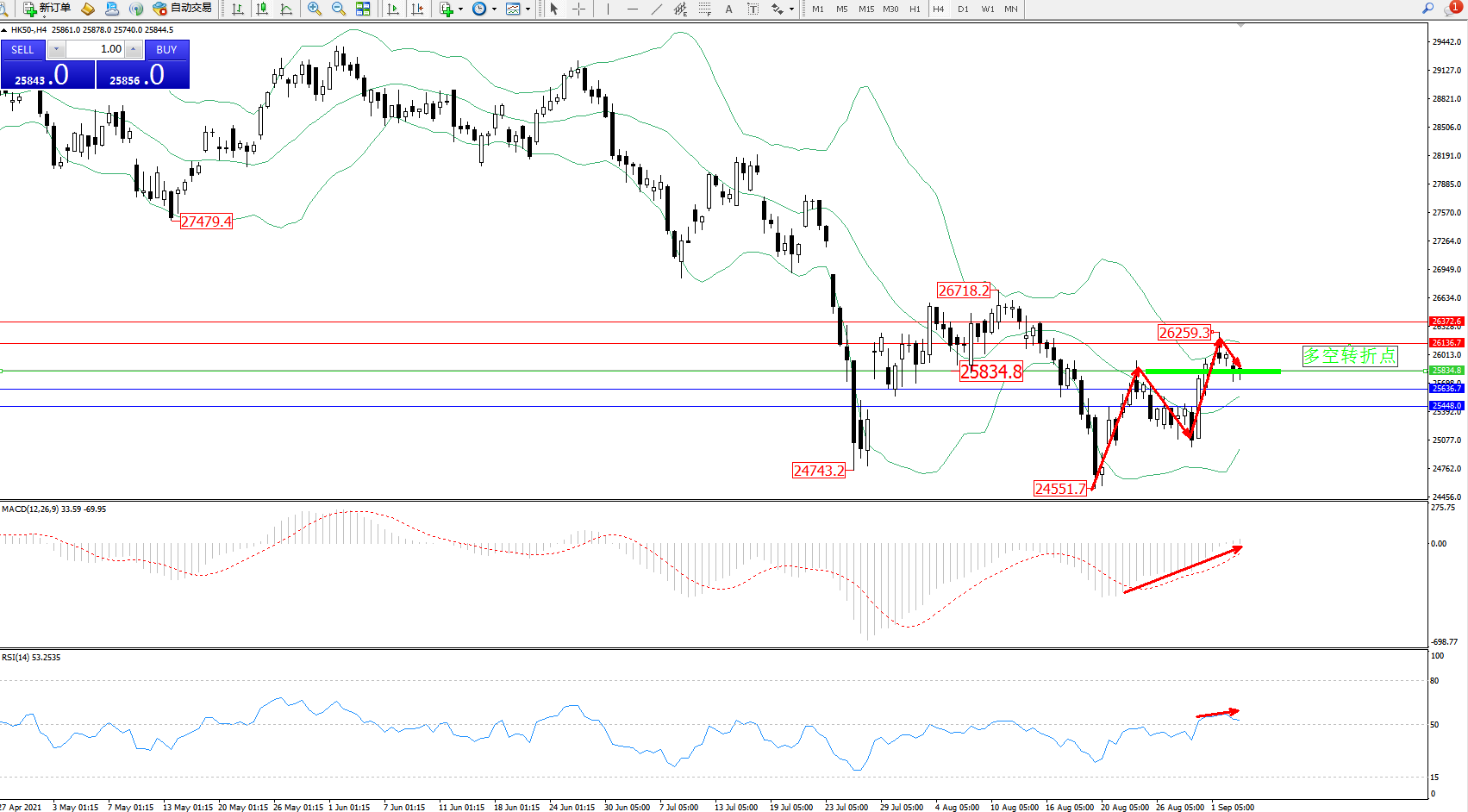 交易策略:25834上方看涨,目标26136、26372