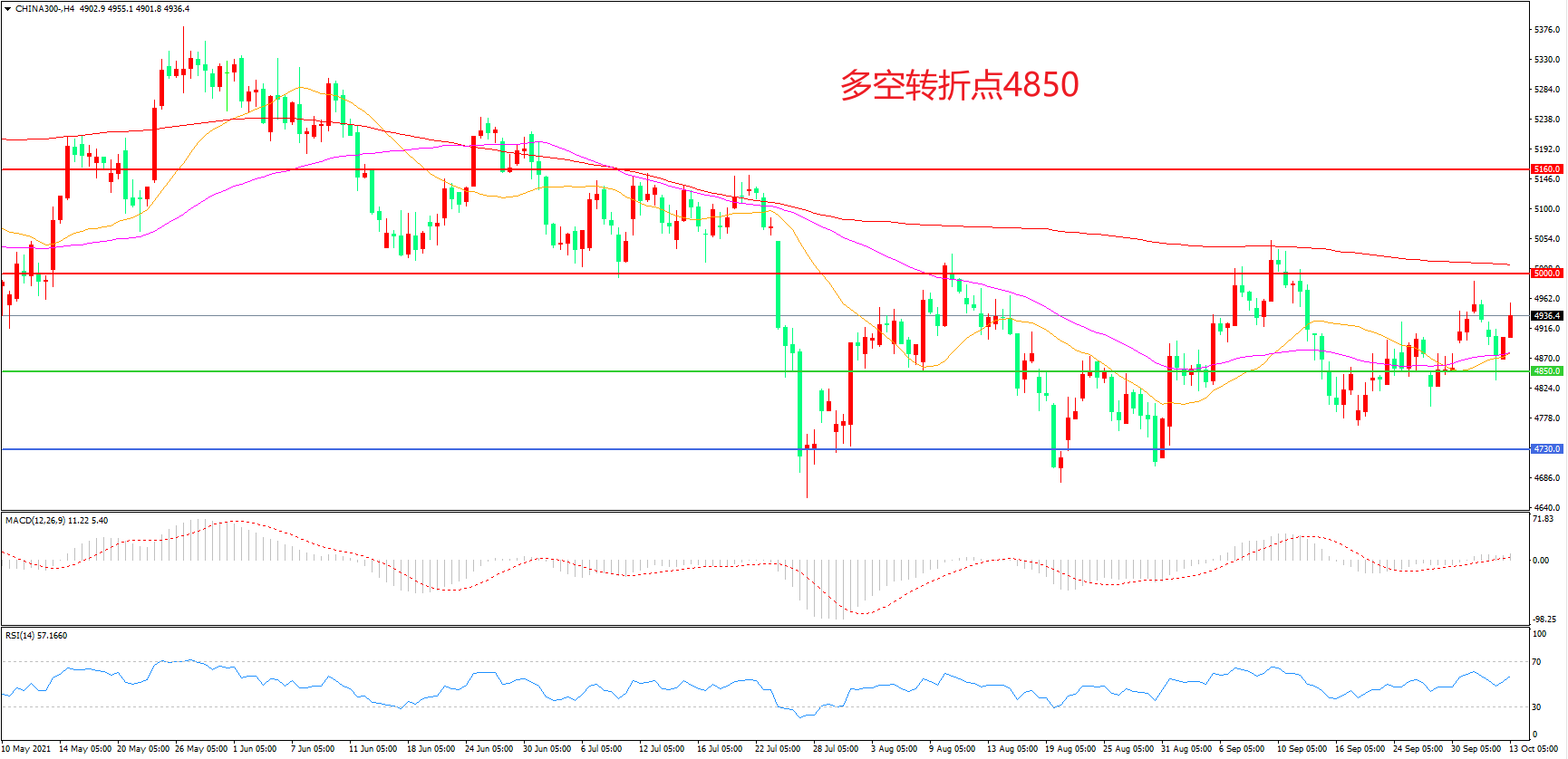 4小时图看,沪深300冲高回落,短期表现降温,但55周期均线支撑仍在,MACD红柱缩短RIS指标向下,日内延续震荡概率较大。
