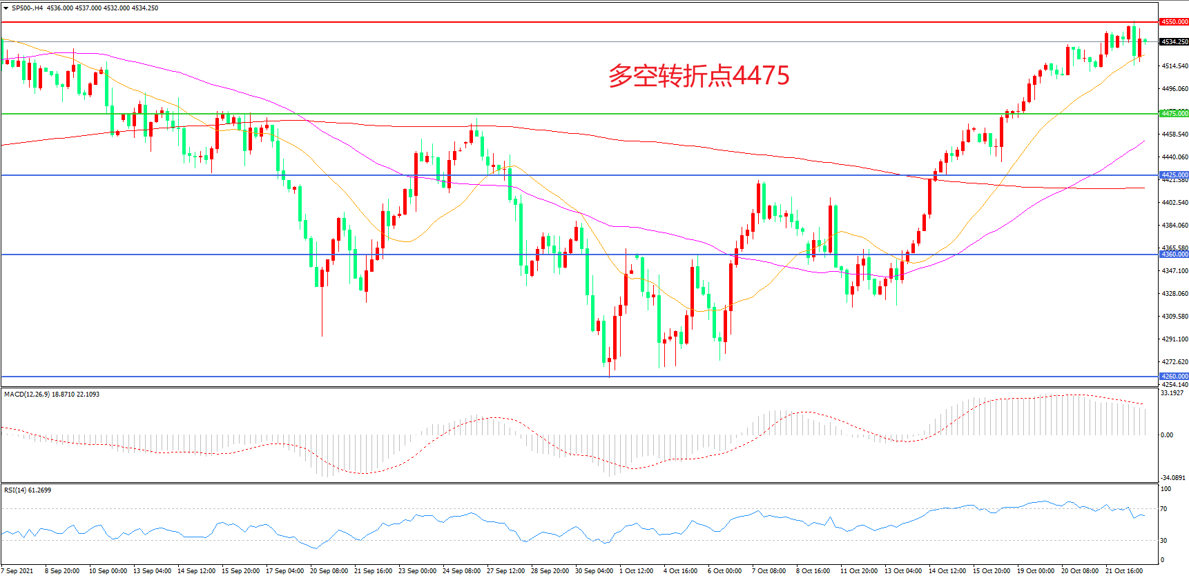 上周五(10月24日),美联储主席鲍威尔明确表示若“看到通胀预期持续走高的严重风险”,美联储就将采取行动,这令市场的通胀担忧重新升温,标普500小幅调整,收报4534.25点。根据今年的财报季显示,美国企业利润率受到的损害仍然很小,这也解释了为何10月份的股价持续上行,如果经济恢复能够重新带来强劲需求,标普有望再创新高。