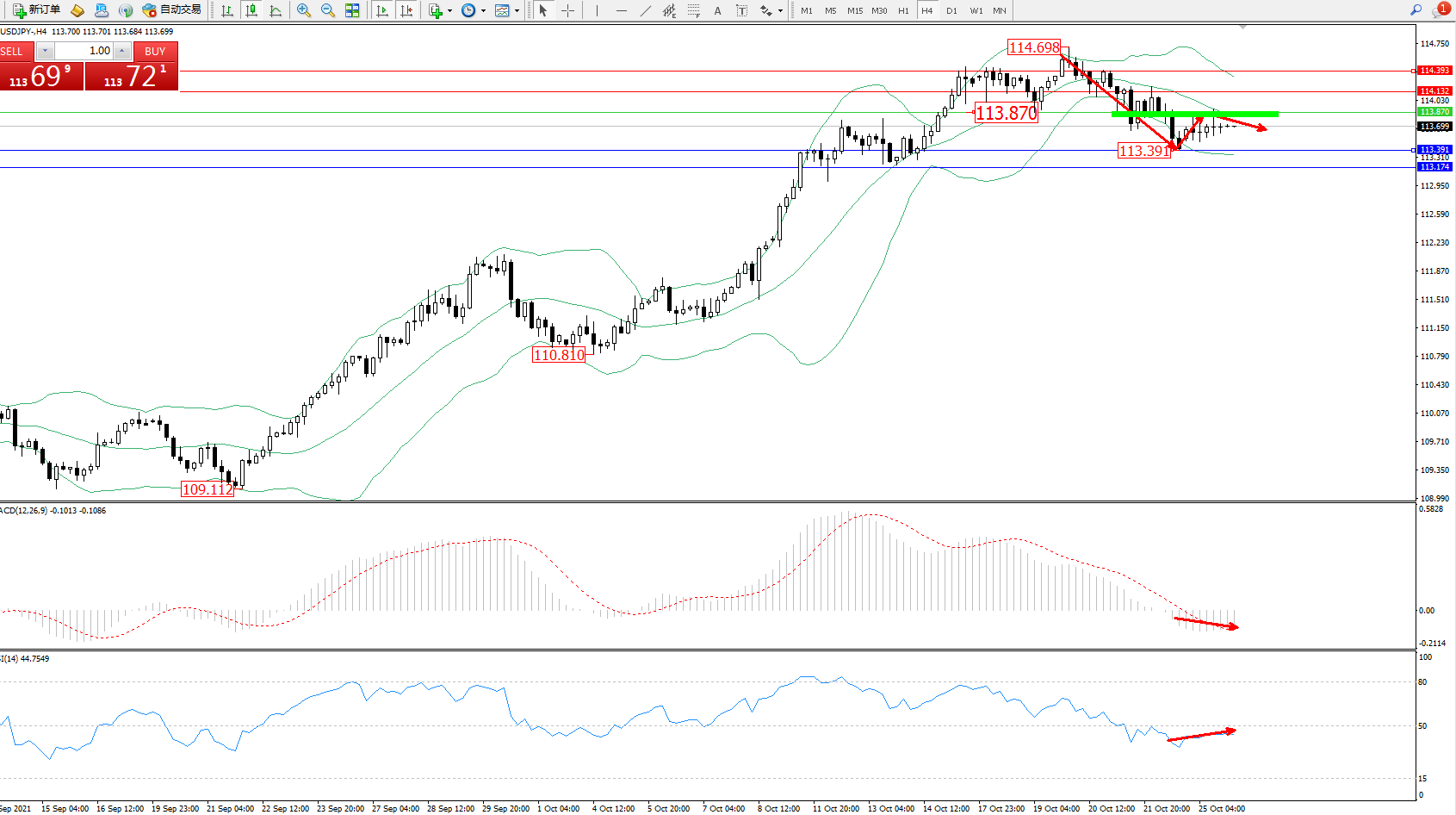 技术点评:高位空头动力维持在布林带指标通道中下轨区间窄幅整理下行,短期触及113.391位置后得到短暂支撑开始整理平移,即将触及布林带指标中轨附近节点,布林带指标呈收口走势持续中,MACD指标处于0轴线下方空头区域维持窄幅整理平移,RSI指标处于50均衡线下方空头区域弱势徘徊中;