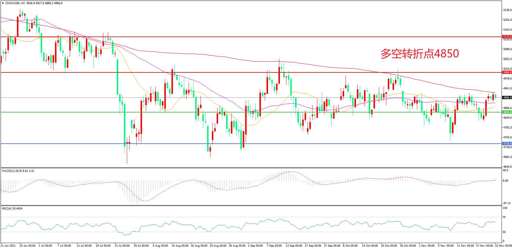 4小时图看,沪深300延续窄幅震荡态势,整体波幅不大,200周期均线阻力在即,55周期均线成为下方支撑,MACD红柱缩短,RSI指标走平,日内震荡向上概率较大。