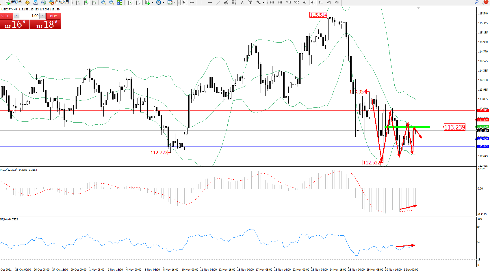技术点评:空头动力延续布林带指标中下轨区间持续震荡下行,低位抵达112.522位置后开始波幅空间逐渐收窄,期间多次触及布林带指标中下轨区间节点,布林带指标呈收口平缓下行中,MACD指标处于空头区域维持整理平移后有上移迹象,RSI指标处于空头区域维持弱势整理缓慢向上移动;