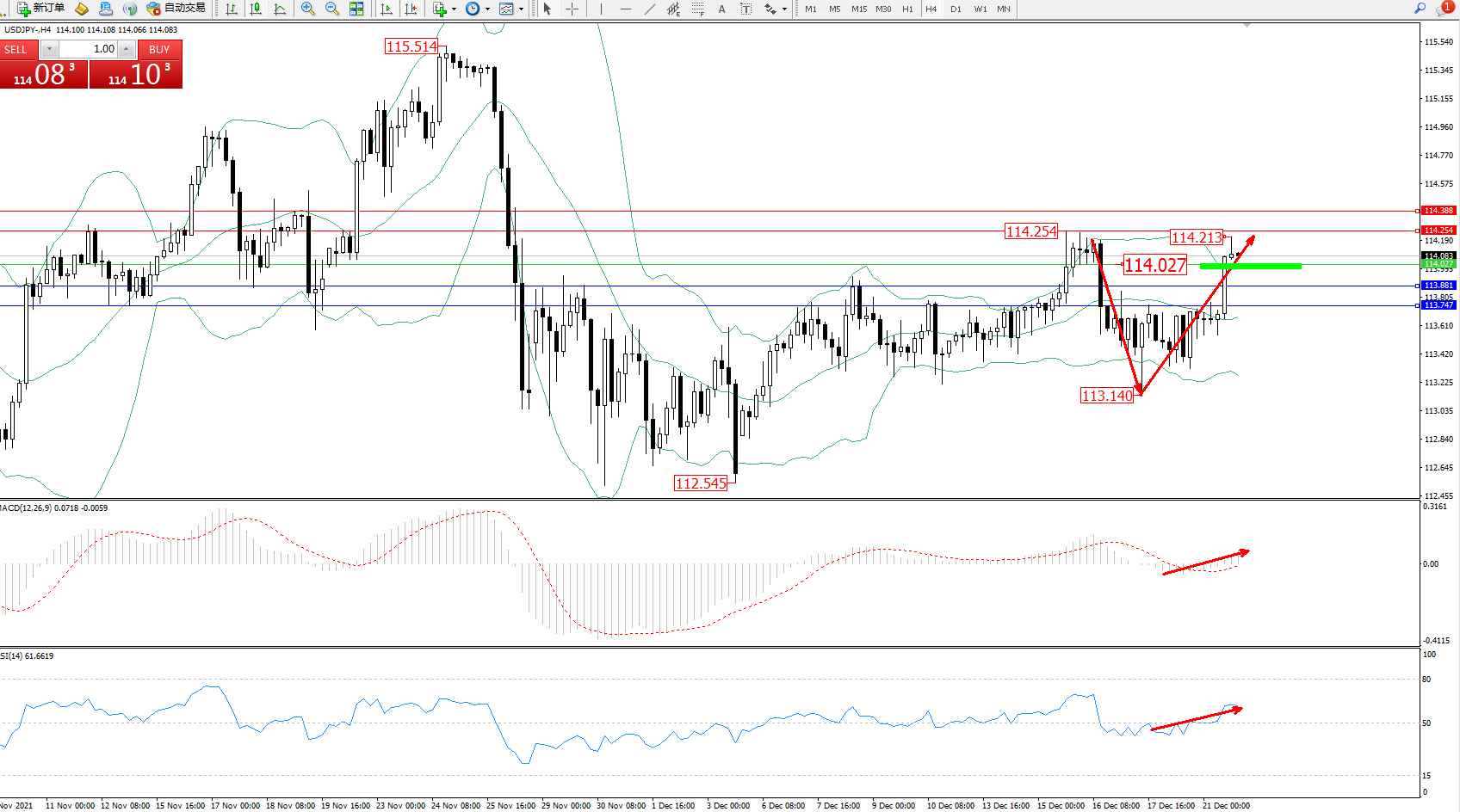 技术点评:空头动力急速下行至113.140附近得到支撑,维持在布林带指标中下轨区间持续震荡后多头动力强势拉升,突破上轨至114.213位置节点后遇阻整理,布林带指标呈收口走势后开始有张口迹象,MACD指标处于0轴线上側弱势徘徊上移,RSI指标处于50均衡线上側弱势上扬;
