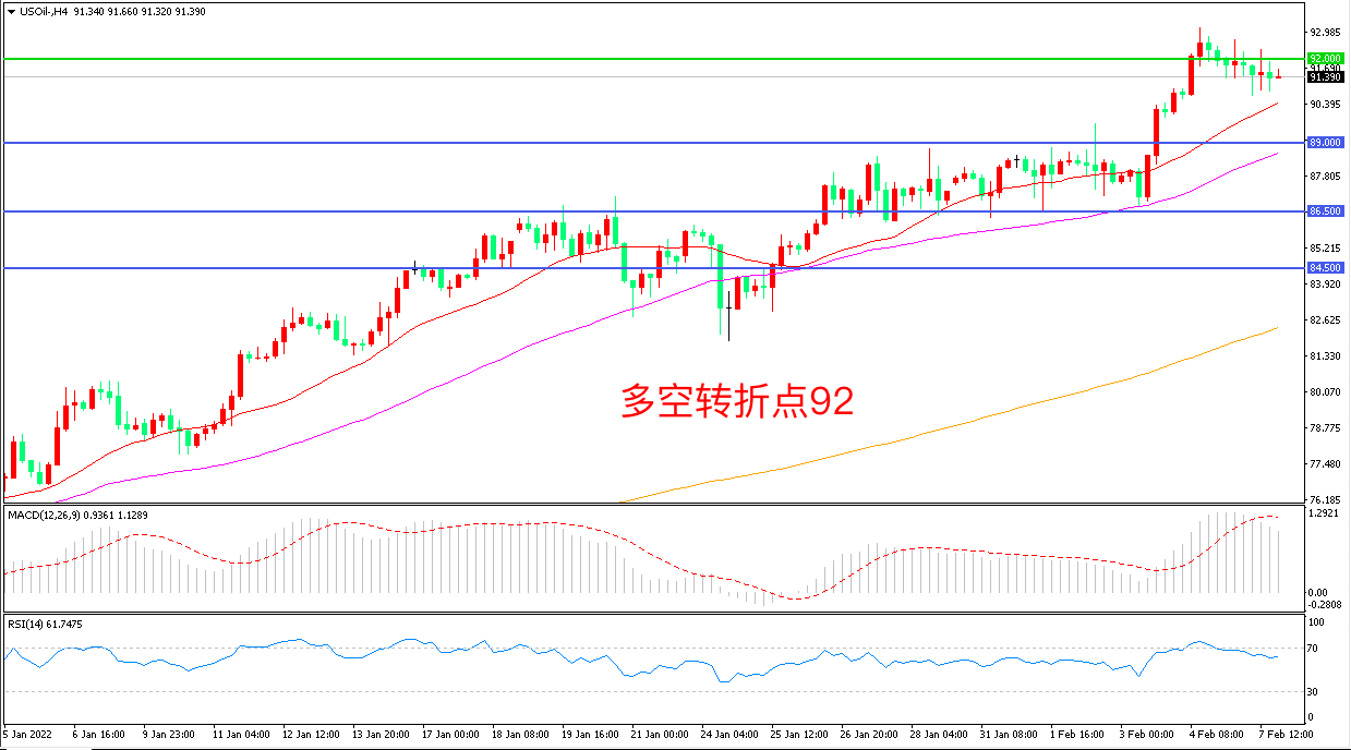 4小时图看,油价连续拉升后小幅回落,整体表现偏强,均线系统拐头向上,92美元成为多空分水岭,MACD红柱缩短,RSI指标走平,日内震荡上行概率较大。