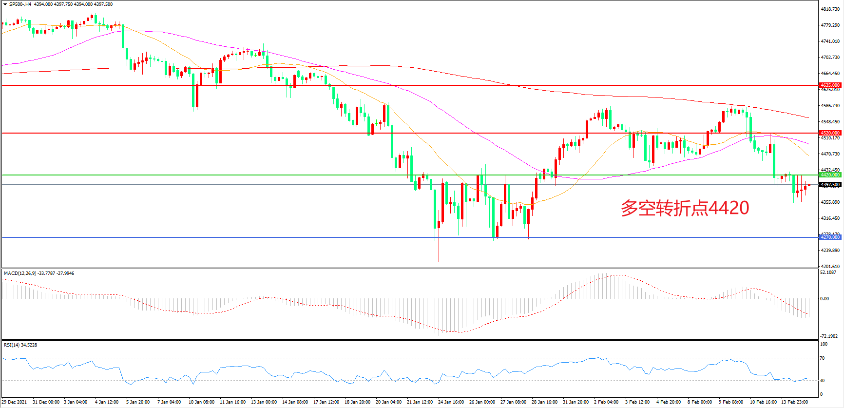 4小时图看,标普500围绕4420窄幅波动,短线走势低迷,均线系统拐头向下,MACD绿柱增加,RSI指标走平,日内震荡下行概率较大。