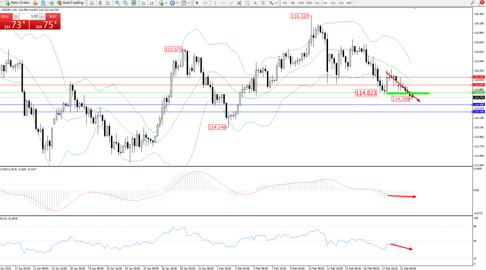 技术点评:延续布林带指标中下轨区间持续震荡下行,低位抵达114.705位置附近窄幅整理,短期空头下行态势良好,布林带指标呈收口走势不断向下移动中,MACD指标处于0轴线下方窄幅整理平移,RSI指标处于50均衡线下侧弱势向下移动中;