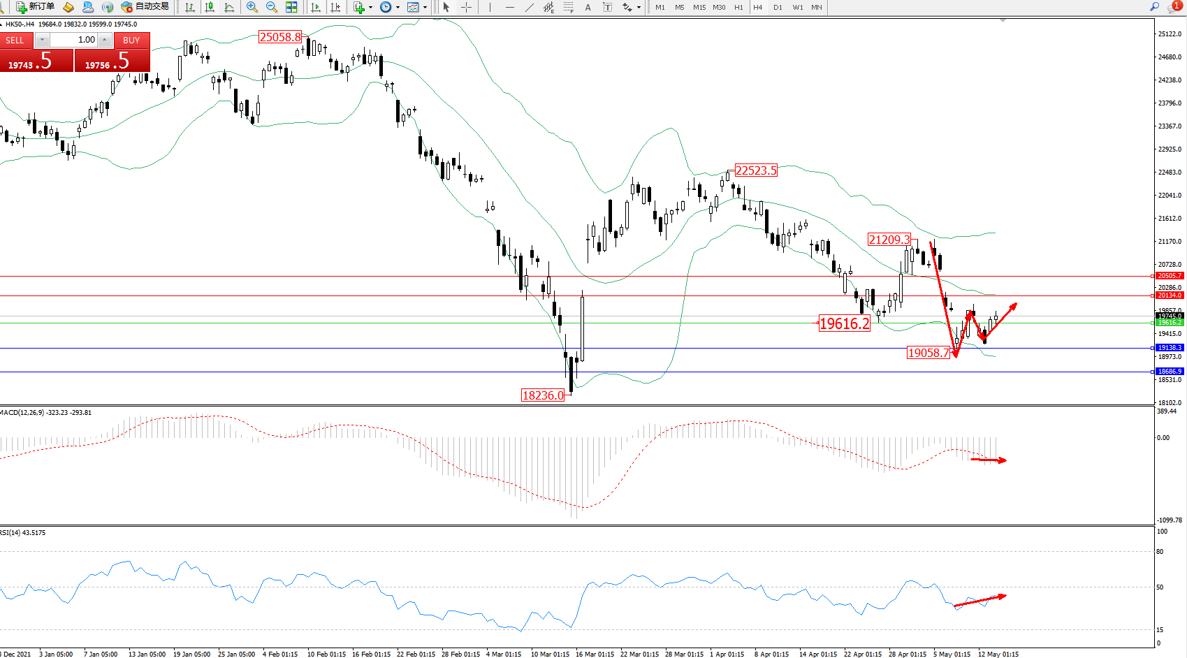 技术点评:空头动力延续布林带指标通道持续震荡下行,低位抵达19058附近节点后开始短暂整理,多头动力有伺机入场迹象,布林带指标呈2空头下行走势后低位开始缓慢张口,MACD指标处于0轴线下方空头区域维持整理平移,RSI指标处于空头区域维持弱势徘徊后开始有上移迹象;