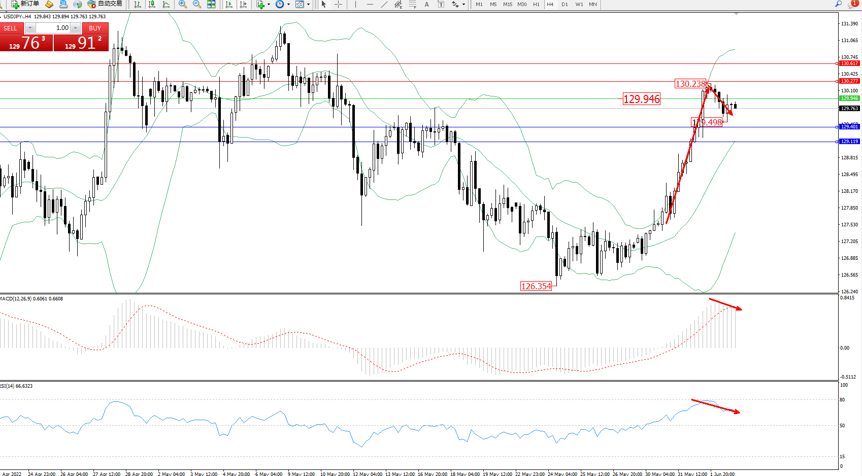 技术点评:多头动力延续布林带指标通道上轨附近持续震荡拉升,高位抵达130.238附近节点后开始整理,短期空头动力伺机入场下移,布林带指标呈张口走势后开始收口不断拉升中,MACD指标处于多头区域高位维持整理,RSI指标处于50均衡线下侧维持弱势震荡中;