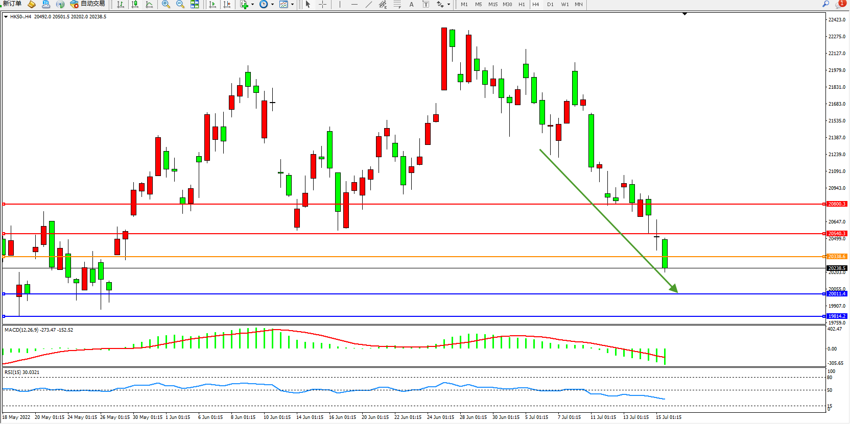 香港恒生指数7月15日(周五)收盘下跌453.49点,跌幅2.19%,报20297.72点;市场忧虑美联储将加息100基点,经济或进入衰退。港股三大指数低开低走,午后跌幅加大。恒生科技指数跌3.22%失守4500点,本周连续跌破三个整数关口。
