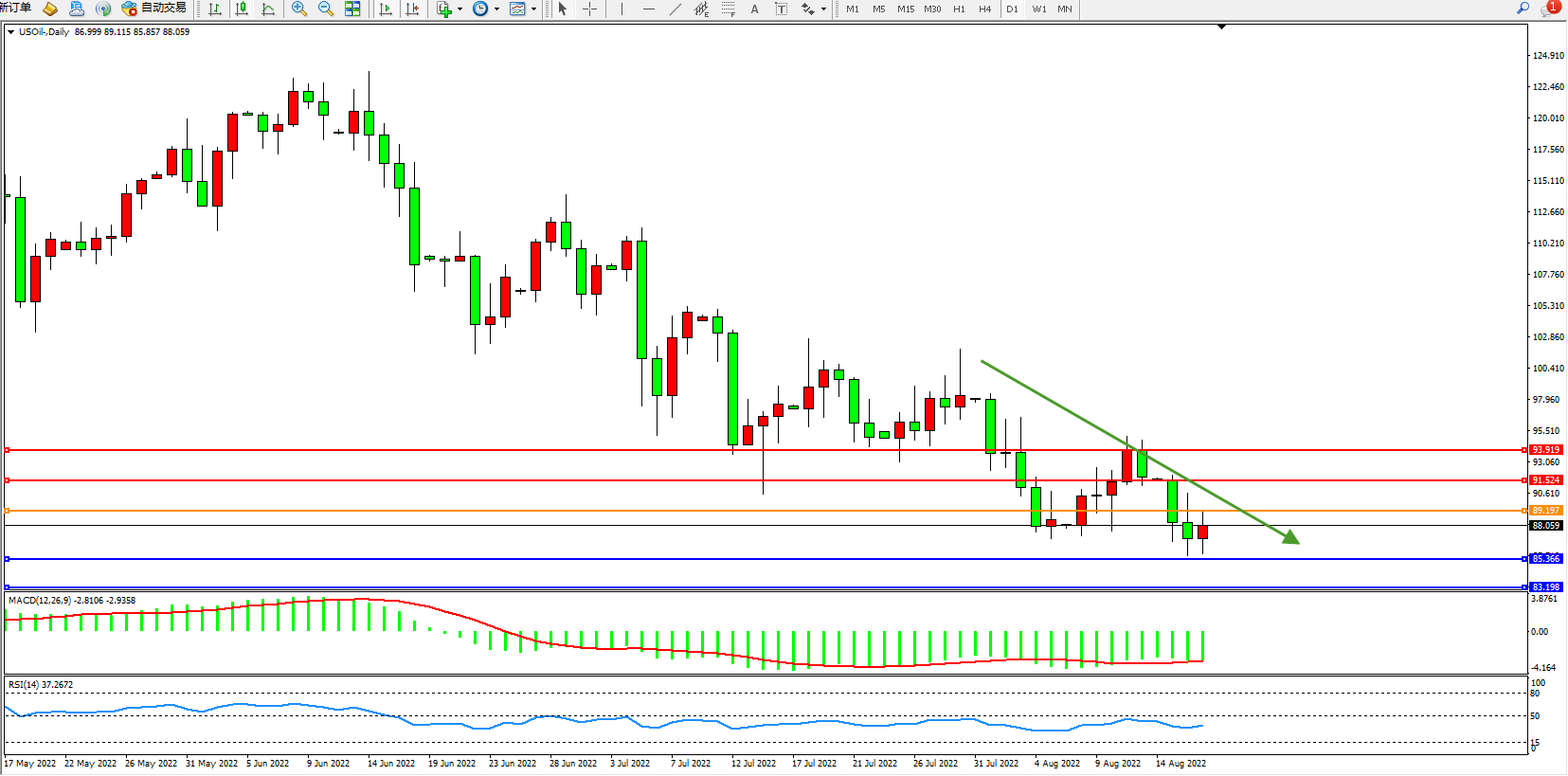 原油维持88.059附近震荡,美国EIA数据显示,截至8月12日当周美国除却战略储备的商业原油库存意外大幅度下降,精炼油库存小幅增加,汽油库存也大幅度下降。EIA数据公布后美国原油价格短线拉升接近1美元。
