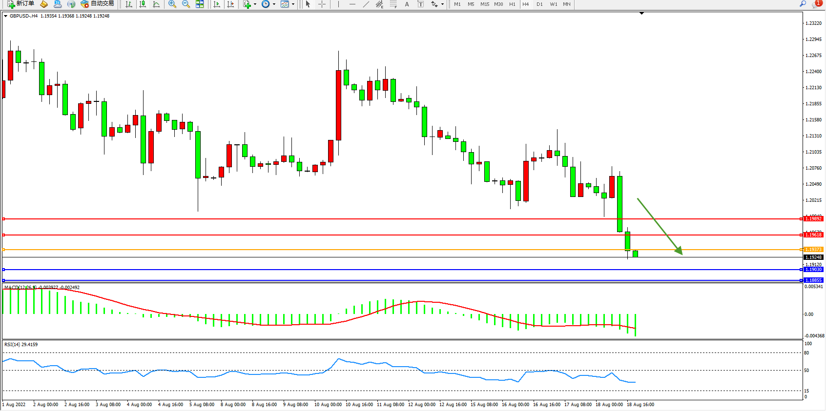 4小时图看:空头动力持续震荡下行,低位弱势持续下挫,短期跌势未见有止步迹象,MACD指标处于空头区域低位整理,RSI指标处于50均衡线下侧空头区域弱势下行;