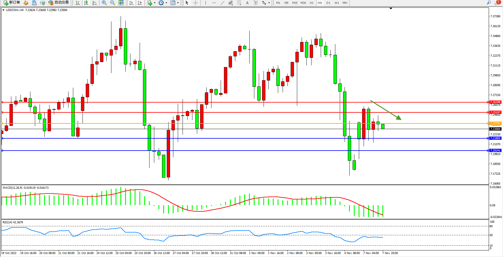 美元兑人民币维持7.23004附近震荡,中国10月以美元计算出口年率 -0.3%,预期4.50%,前值5.70%。海关总署:今年前10个月我国外贸进出口总值同比增长9.5%,外贸继续保持平稳运行。