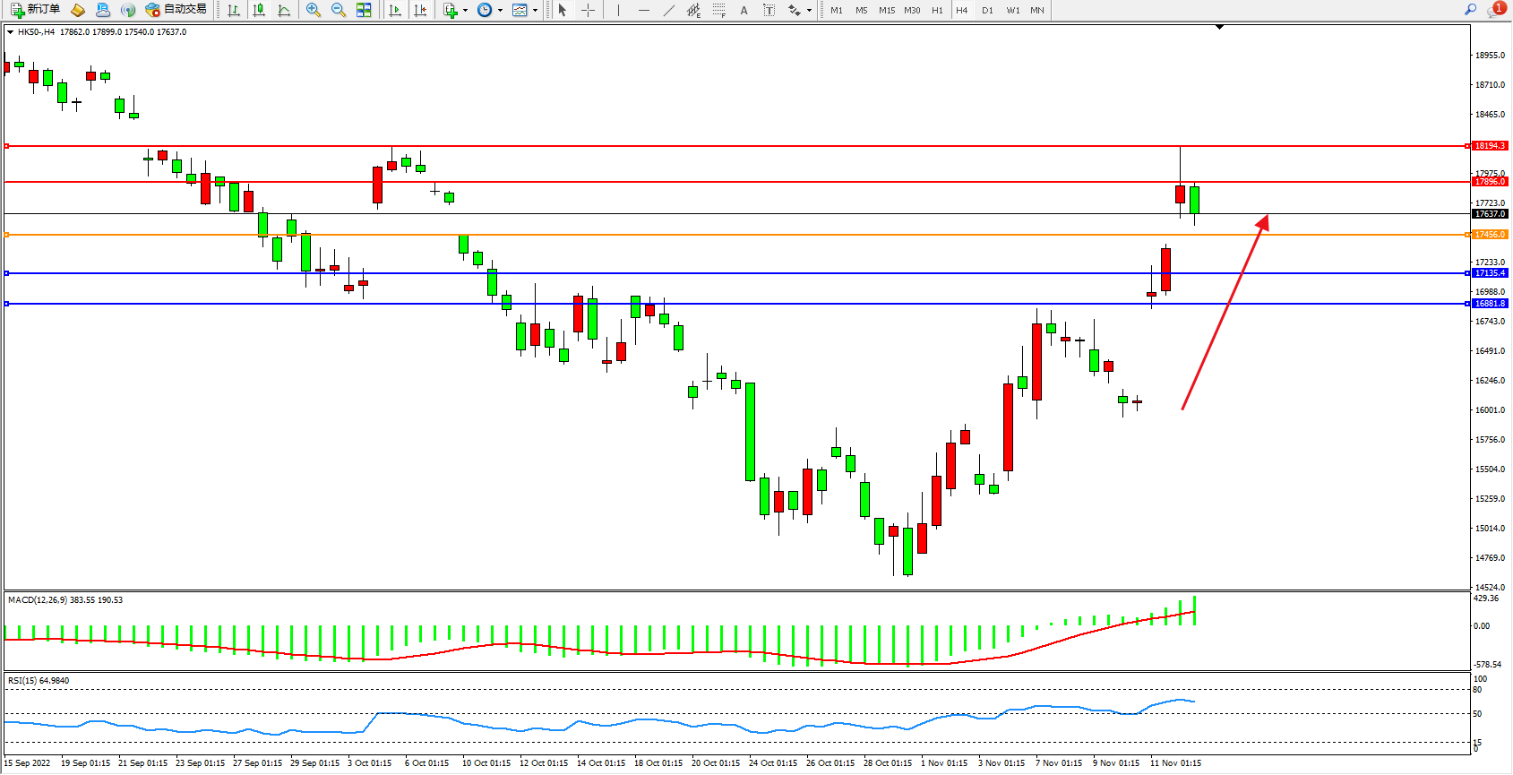 香港恒生指数11月14日(周一)收盘上涨294.05点,涨幅1.7%,报17619.71点;港股全天保持强势行情,三大指数午后略有回落,但最终全线收涨,延续上周反弹行情。恒指涨1.7%上扬近300点,国指涨1.92%,6000点得而复失,恒生科技指数一度大涨4.5%,收涨1.8%,三者均收假阴线。大型科技股部分冲高回落明显,医药类股持续活跃,互联网医疗股领衔上扬,中医药股午后涨幅扩大。南下资金全日净流出6.46亿港元,大市成交额放大至超2000亿港元。