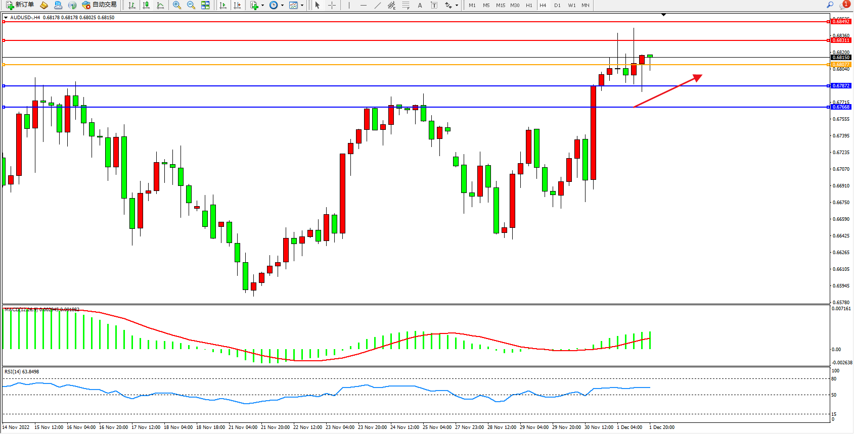 4小时图看:多头动力强势拉升上扬,高位持续震荡上行,短期看涨情绪涌现,MACD指标处于多头区域高位上移,RSI指标处于多头区域徘徊;