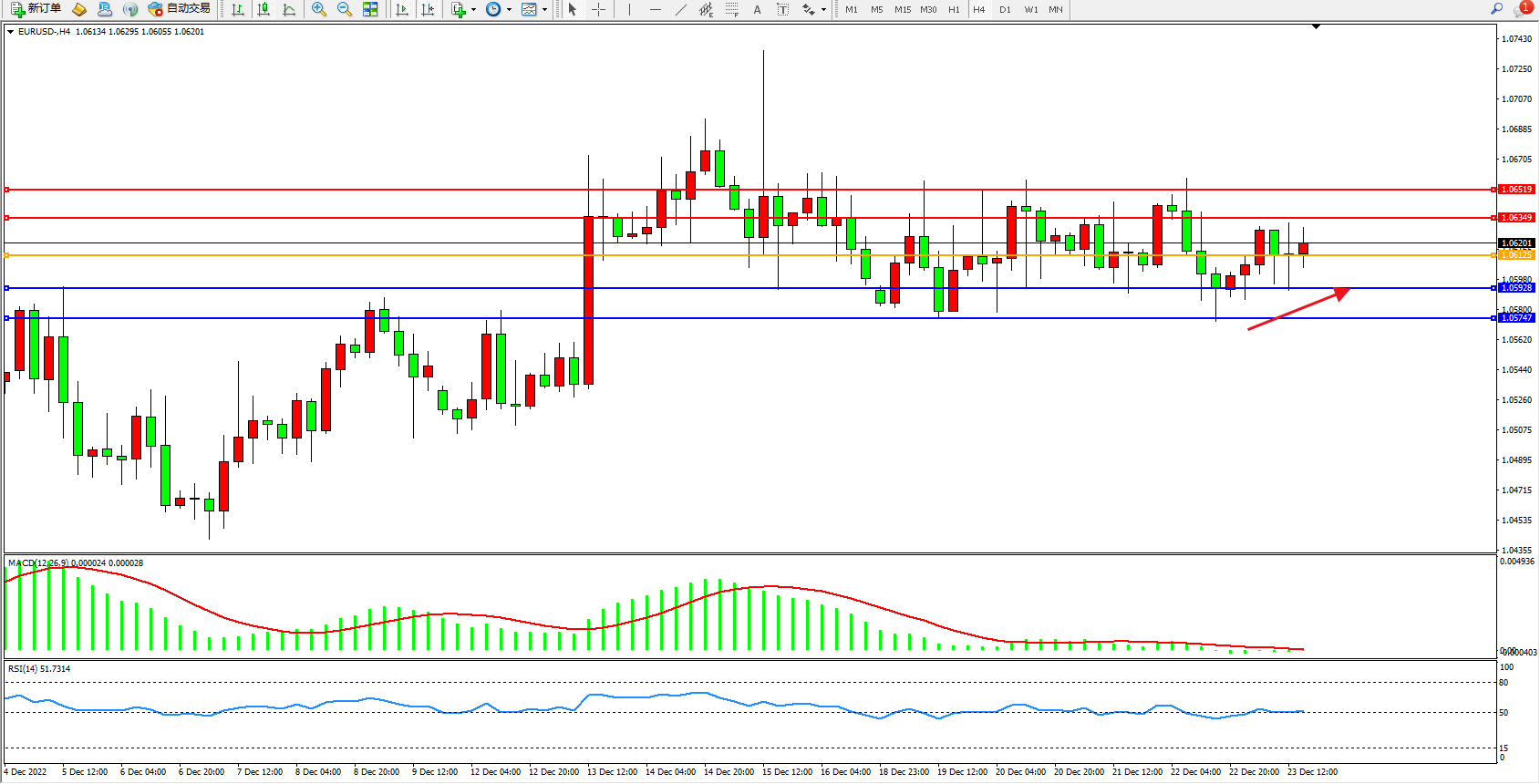 欧元美元EURUSD—4小时K线图显示: