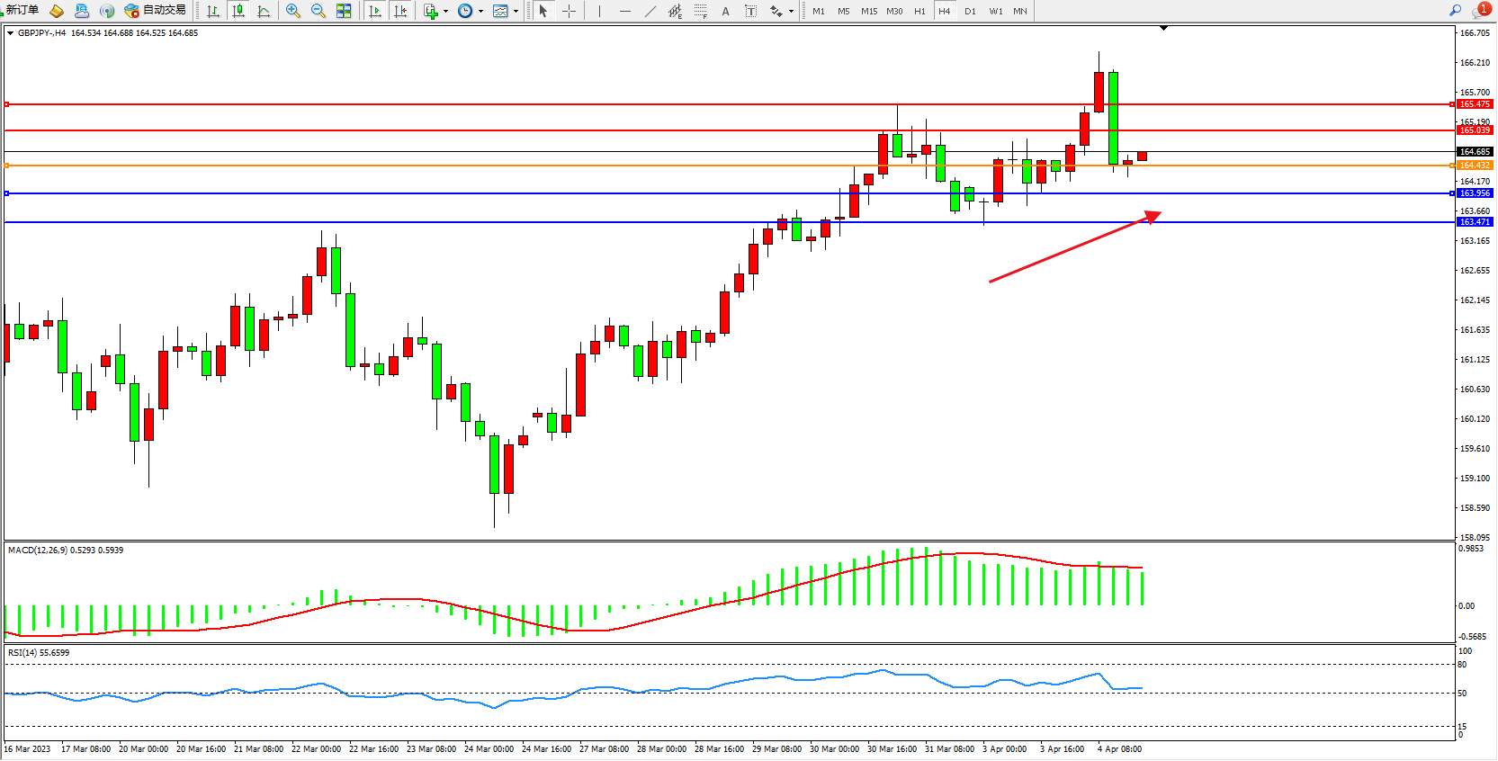 交易策略:164.432上方看涨,目标165.039 165.475