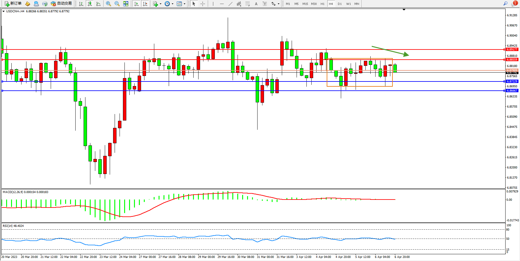 美元兑人民币维持6.87792附近震荡,3月中国制造业和服务业恢复势头出现分化,服务业景气度修复继续提速。4月6日公布的2023年3月财新中国通用服务业经营活动指数(服务业PMI)录得57.8,较前月上升2.8个百分点,创下28个月以来新高,连续三个月处于扩张区间。美国CME耶稣受难日,旗下外汇期货合约提前于北京时间8日00:15结束交易。