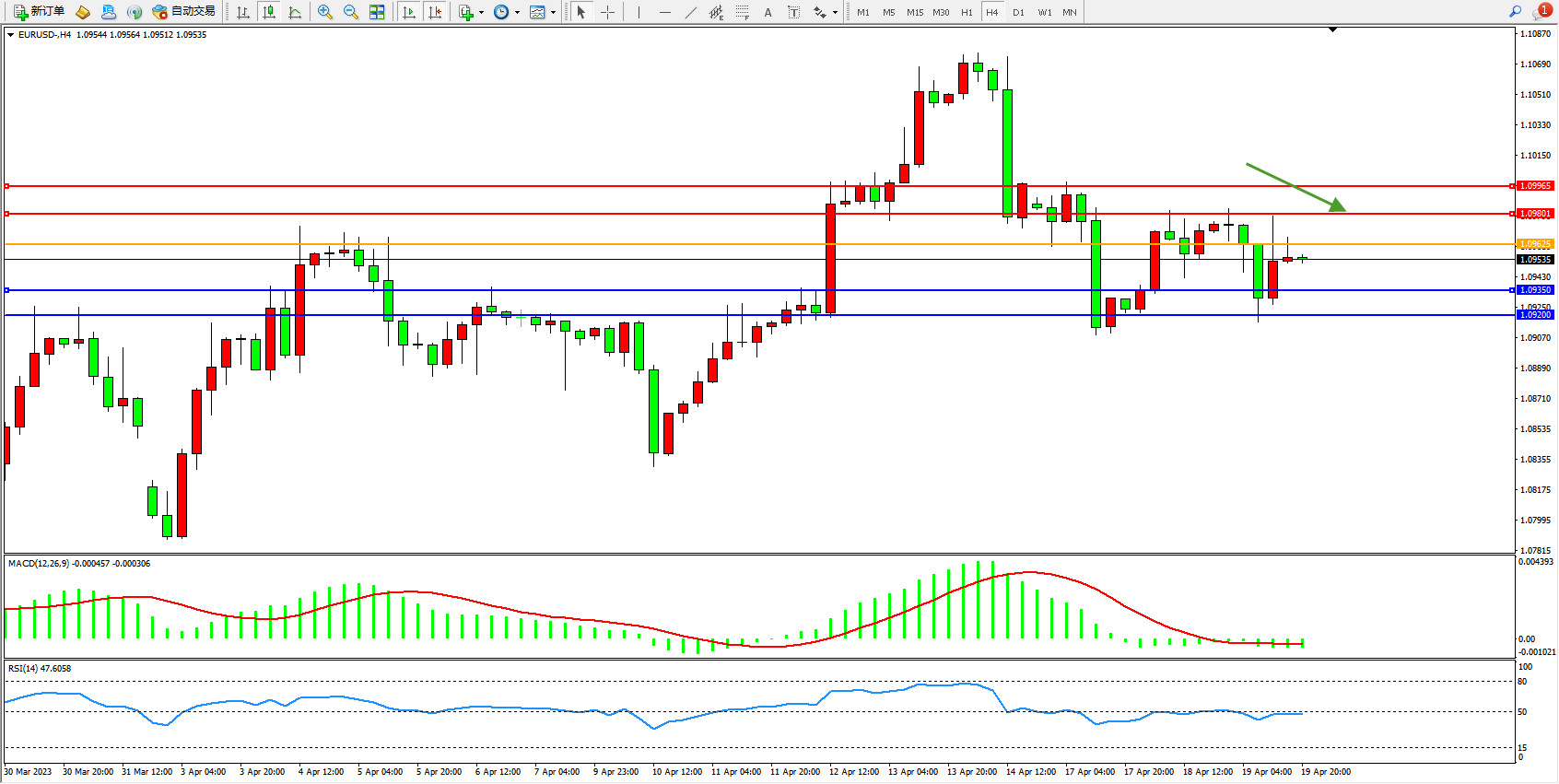 4小时图看:市场短期维持宽幅震荡,短期空头情绪有所减弱,但依旧维持震荡下移迹象,MACD指标处于0轴线下侧徘徊,RSI指标处于50均衡线下侧弱势整理;