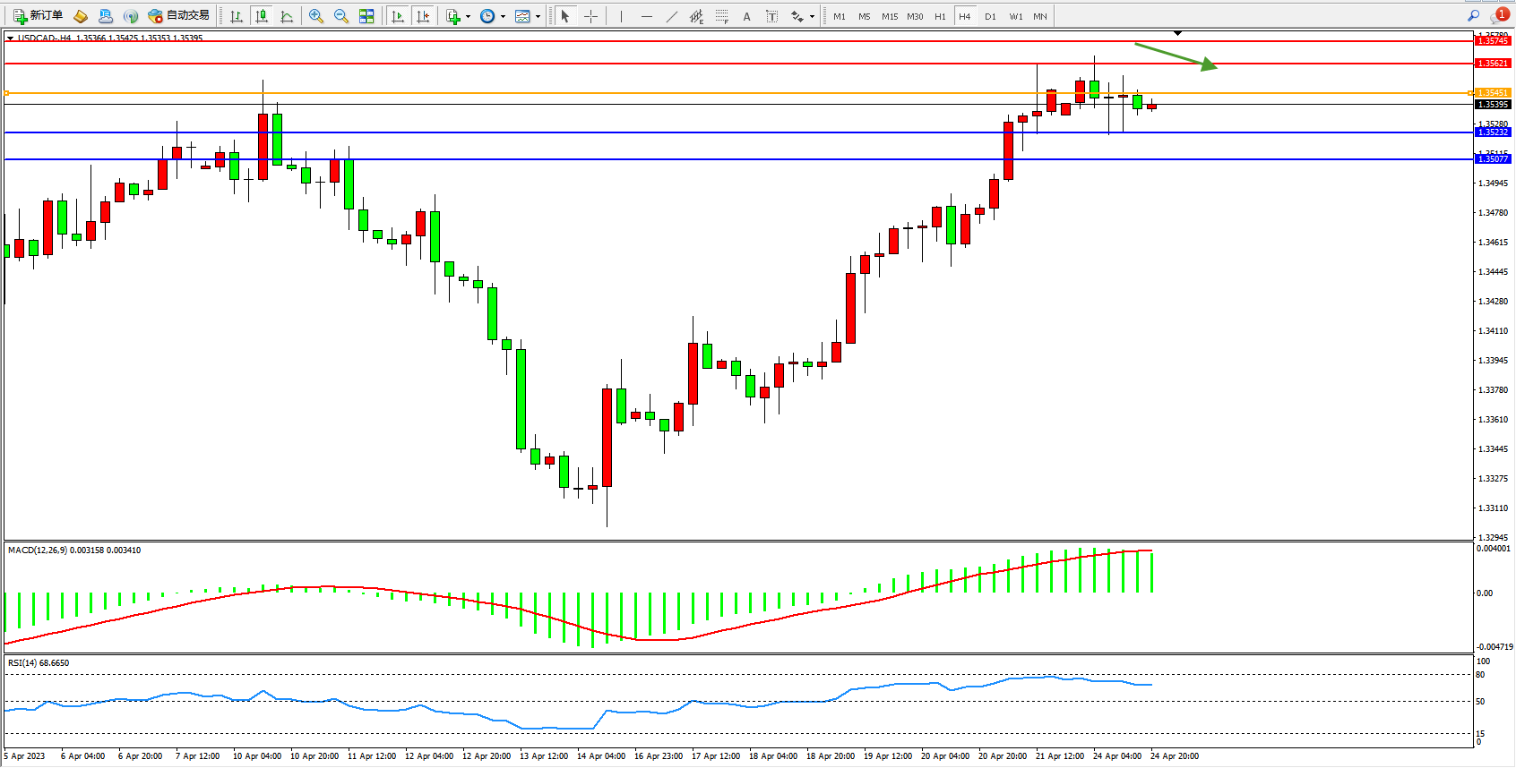 4小时图看:多头动力持续震荡上扬,高位短期遇阻徘徊,市场看涨情绪开始有所减弱,空头动力伺机入场,MACD指标处于多头区域维持整理,RSI指标处于多头区域维持徘徊;