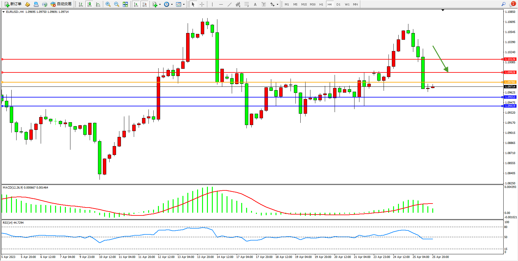 欧元美元EURUSD—4小时K线图显示: