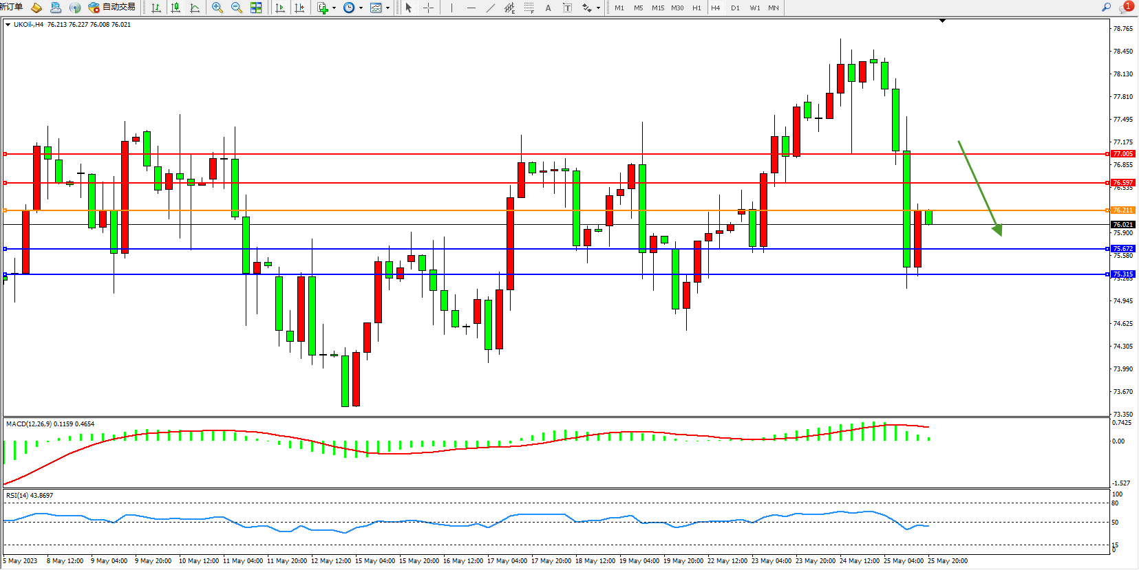 交易策略:76.211下方看跌,目标75.672  75.315