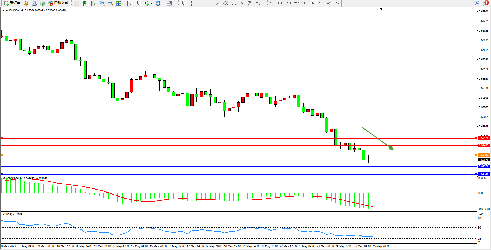 交易策略:0.65182下方看跌,目标0.64920 0.64740