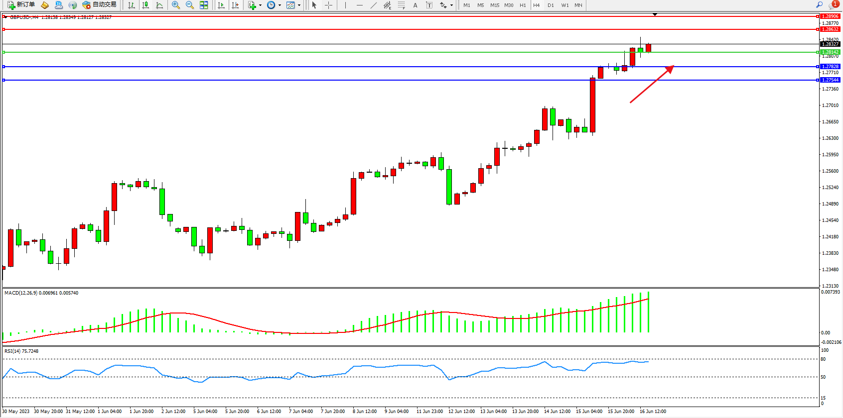 4小时图看:高位多头动力维持震荡上移,市场看涨情绪依据,短期有继续向上移动中,MACD指标处于多头区域高位上移,RSI指标处于多头区域高位整理;
