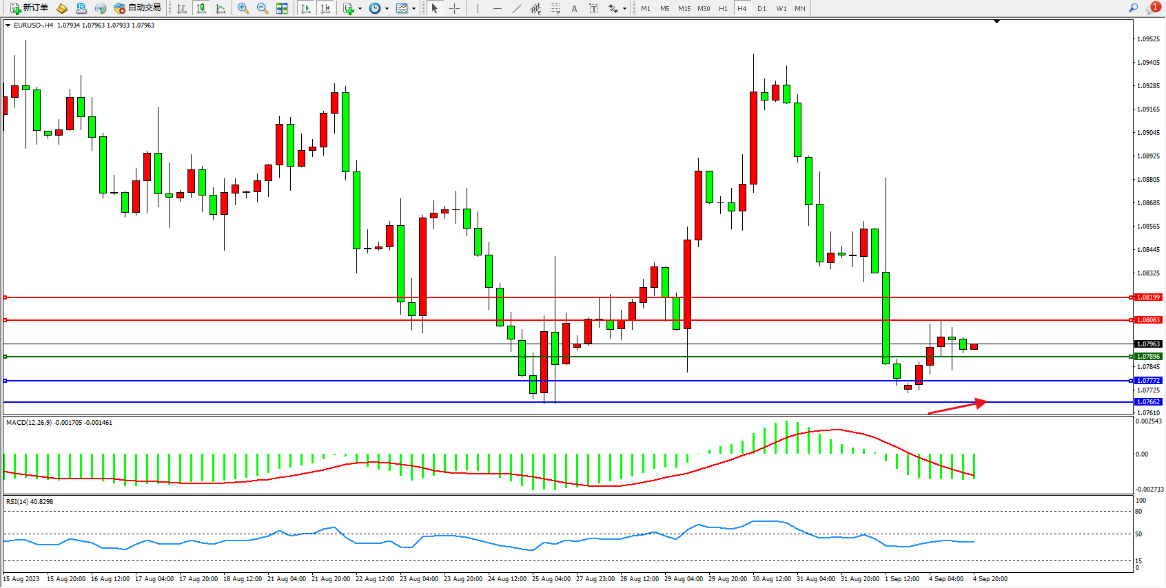 欧元美元EURUSD—4小时K线图显示: