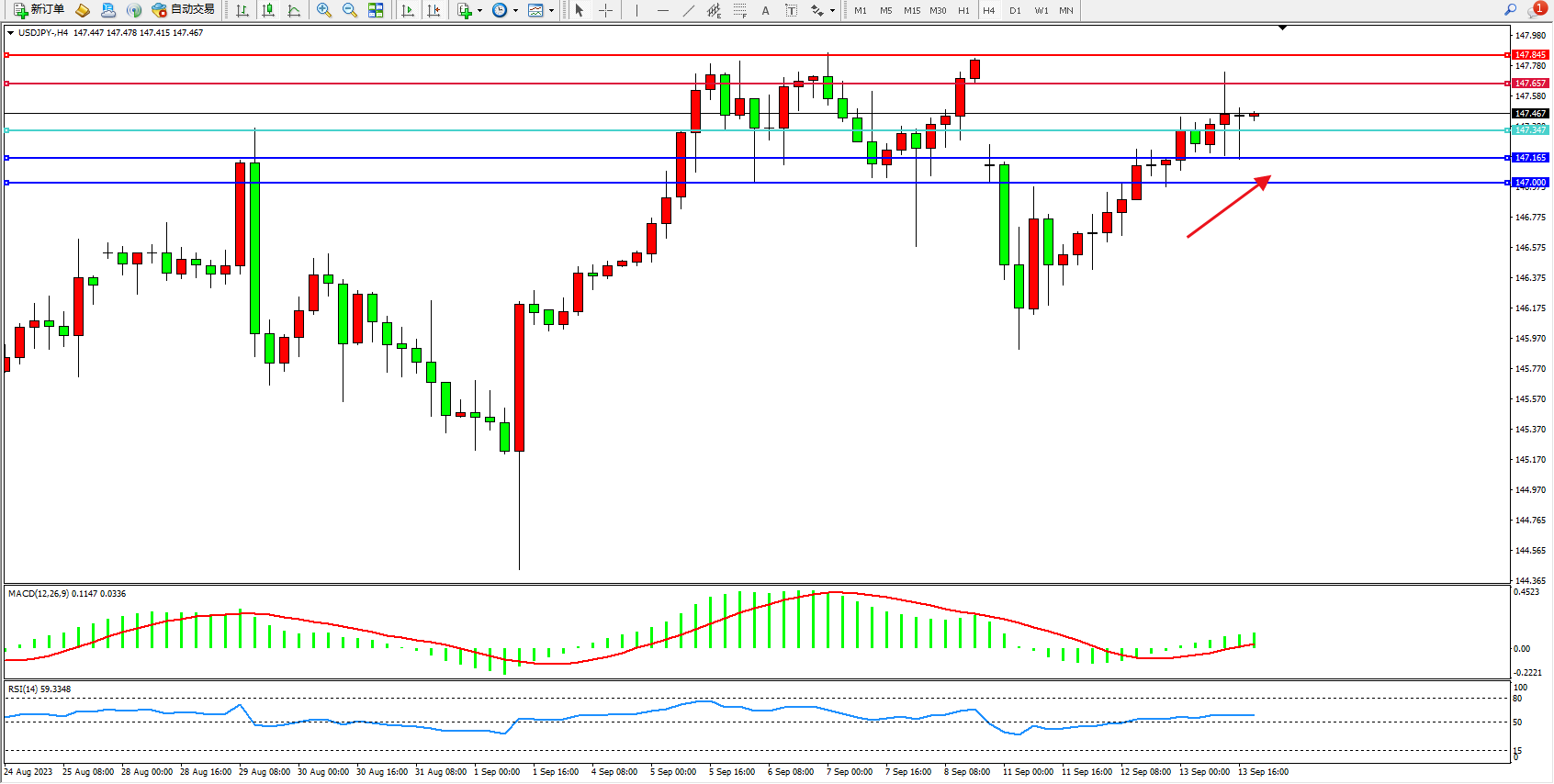 交易策略:147.347上方看涨,目标147.657  147.845