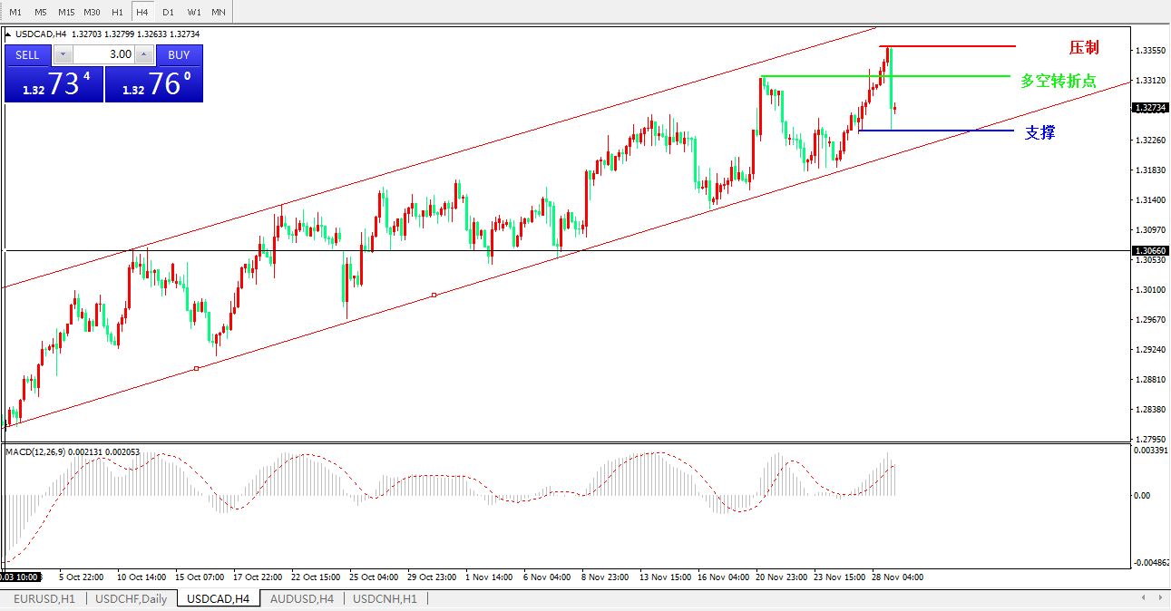技术面简析:上攻态势受MACD3顶背离限制,汇价有望回测通道下轨。