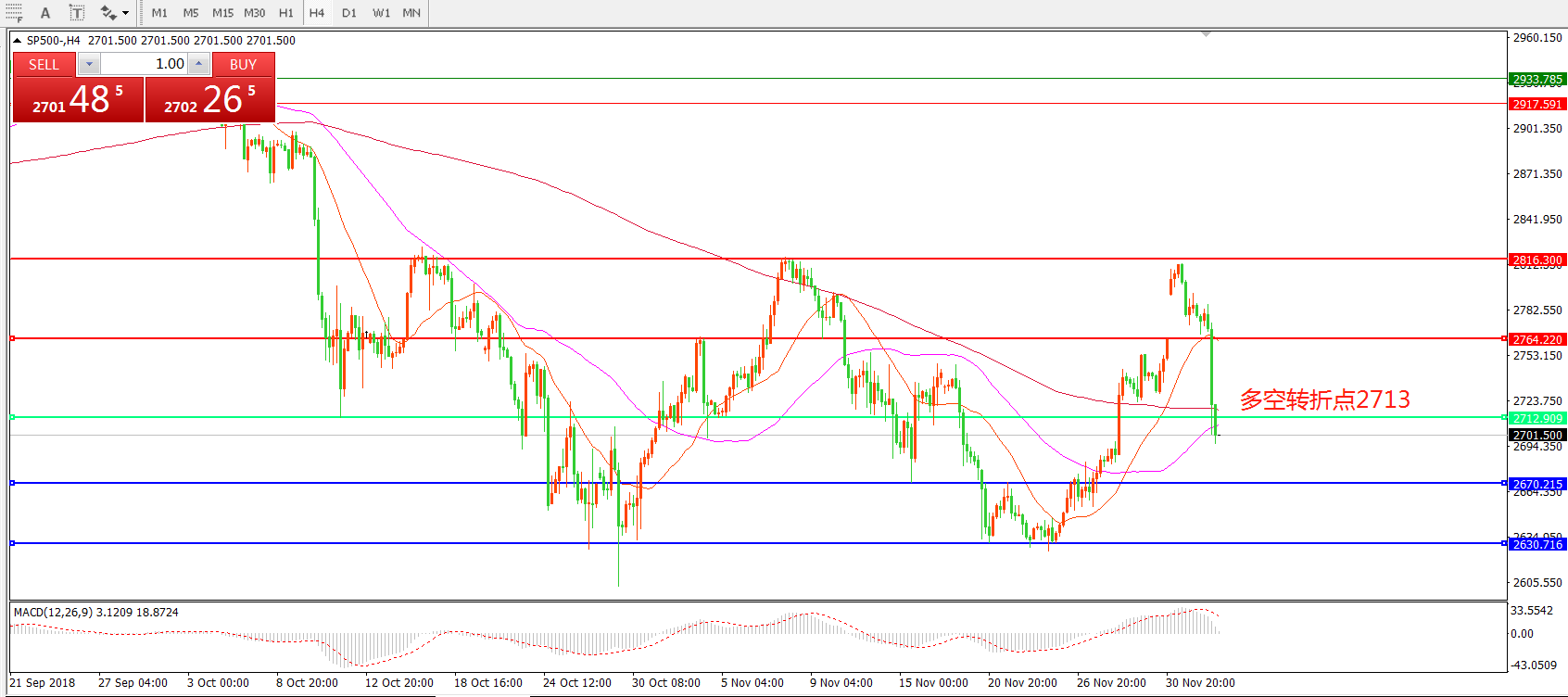4小时图看,标普500连续下破关键支撑,整体价格直接跌至55周期均线以下,21周期均线稍有拐头迹象,MACD红柱缩短。小幅反弹后有继续回落可能,重点关注多空转折点2713一线