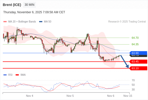 在 63.90 之下,看跌,目标价位为 63.45 ,然后为 63.10 。