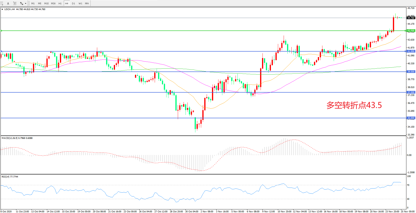 4小时图看,油价长阳拉升,突破前期整理区间,短期表现十分强势,43.5一线被成功突破,均线系统拐头向上,MACD红柱增加,RSI指标走平,日内震荡上行概率较大。