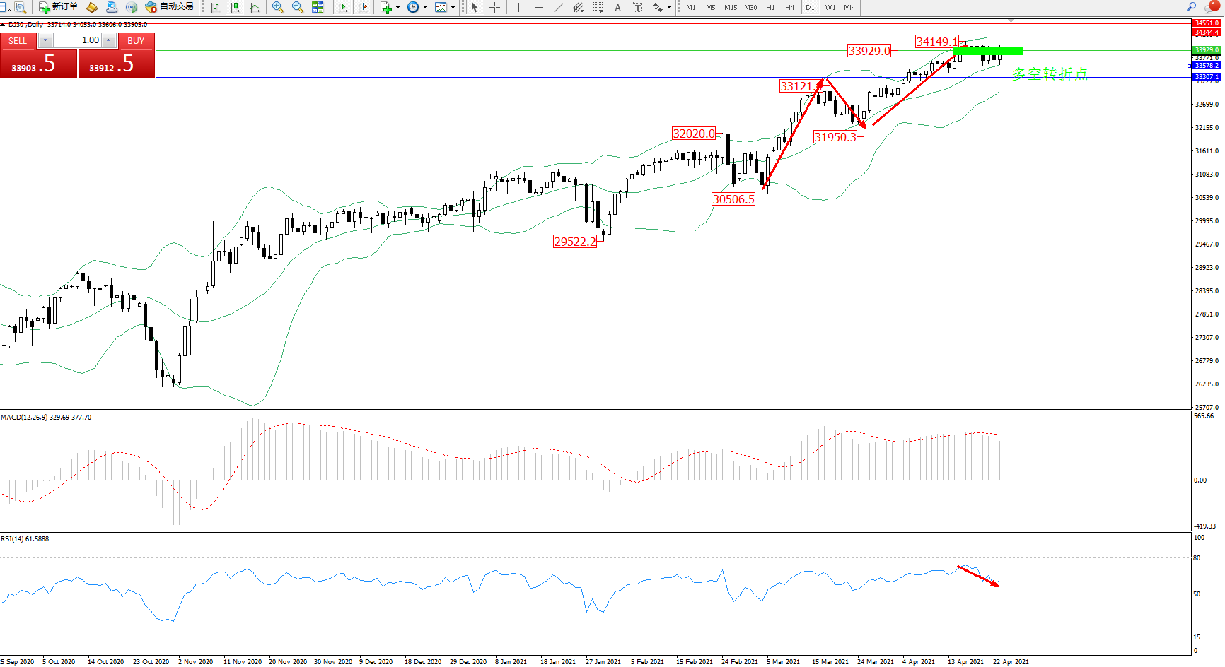 道琼斯指数4月23日(周五)收盘上涨227.78点,涨幅0.67%,报34043.68点;美股三大股指集体高收,道指初步收涨。此前制造业和新屋销售数据突显经济繁荣;巨头股上涨,因市场预期它们下周将公布强劲业绩。科技股和金融股领涨。投资者对未来风险的焦虑程度大幅下降。美股周四遭遇抛售,因美国总统拜登计划将资本利得税税率提高近一倍的消息令投资者感到恐慌,分析师认为此次下跌是下意识的反应,并指出经济前景强劲。在疫情期间保持安静的企业正在发布指引,而美债收益率下降和业绩超出预期正在推动涨势。人们对未来有很多期待,我们已经看到实际报告超出这些非常高的预期,收益率已经回落,这对科技股非常有利。