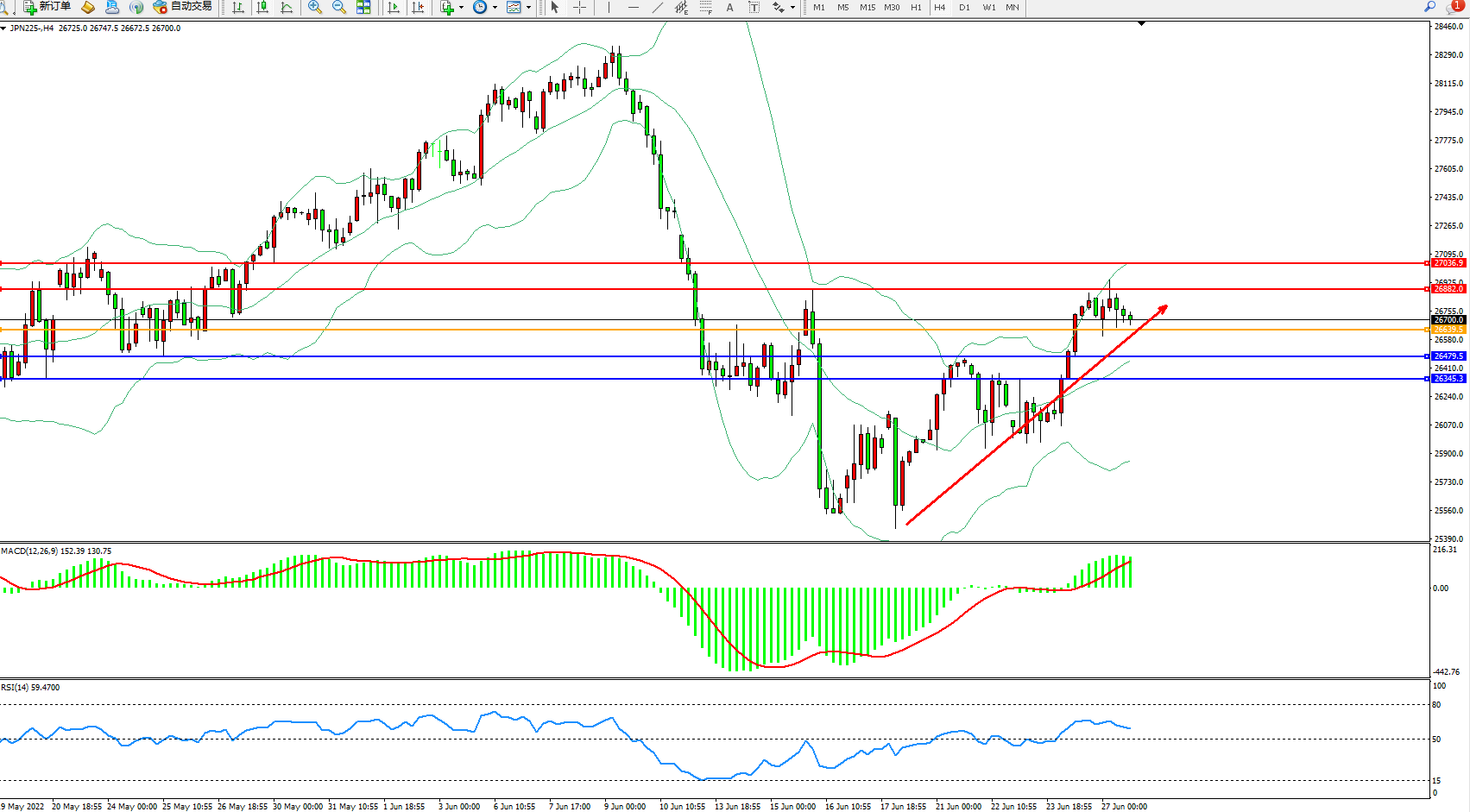 日经225指数6月27日(周一)收盘上涨385.53点,涨幅1.46%,报26877.50点。;日本半导体设备前五个月销额超756亿元,创历史新高;日本政府将从7月开始要求禁止员工从事副业的公司解释其原因,此举旨在鼓励更多的大公司允许其员工从事副业。