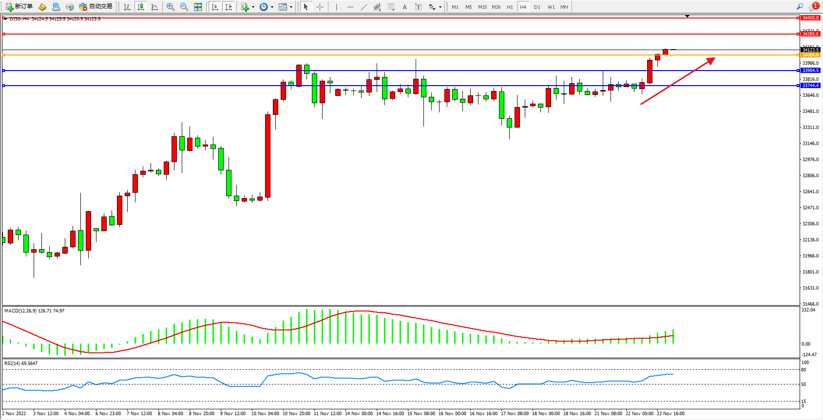 道琼斯指数11月22日(周二)收盘上涨397.82点,涨幅1.18%,报34098.1点;市场情绪似乎集中在美联储加息放缓的前景,或更早转向鸽派政策的前景。如果美联储加息的缓和速度快于通胀下降的速度,将降低实际利率。