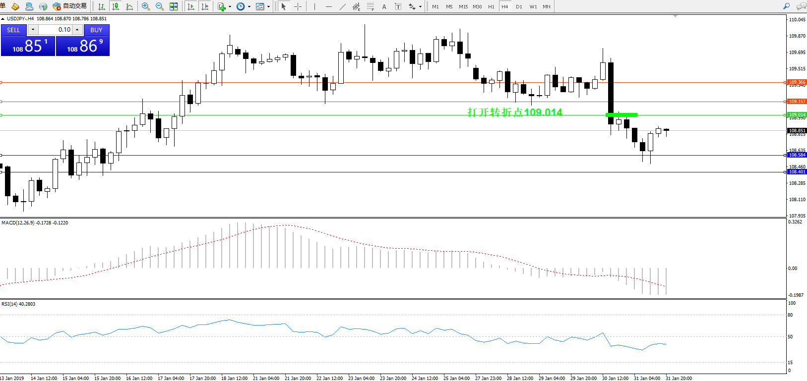 交易策略:109.014下方看跌,目标108.584、108.401
